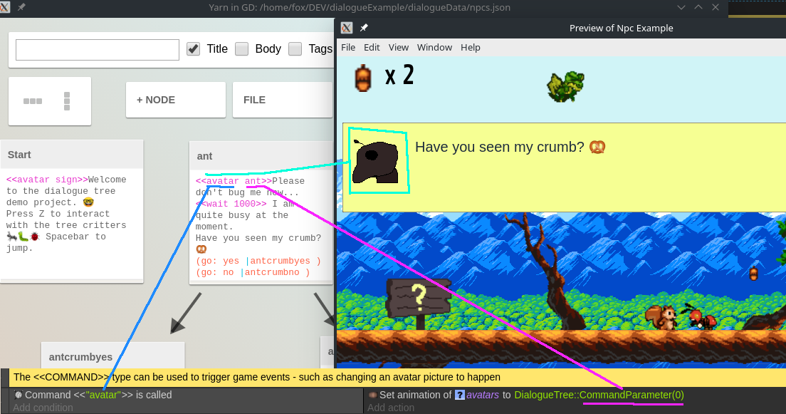 <> when the command avatar is triggered, the avatar's sprite object is set to change its animation to the word after it - CommandParameter(0) (ant)